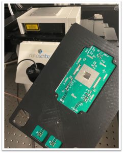 The sample itself is mounted onto a dedicated high-frequency PCB, which is attached to two scanning stages: either 300um x 300um x 300um piezo-based scanning with 1nm resolution, or 100mm x 100mm mechanical scanning with sub-micron resolution.