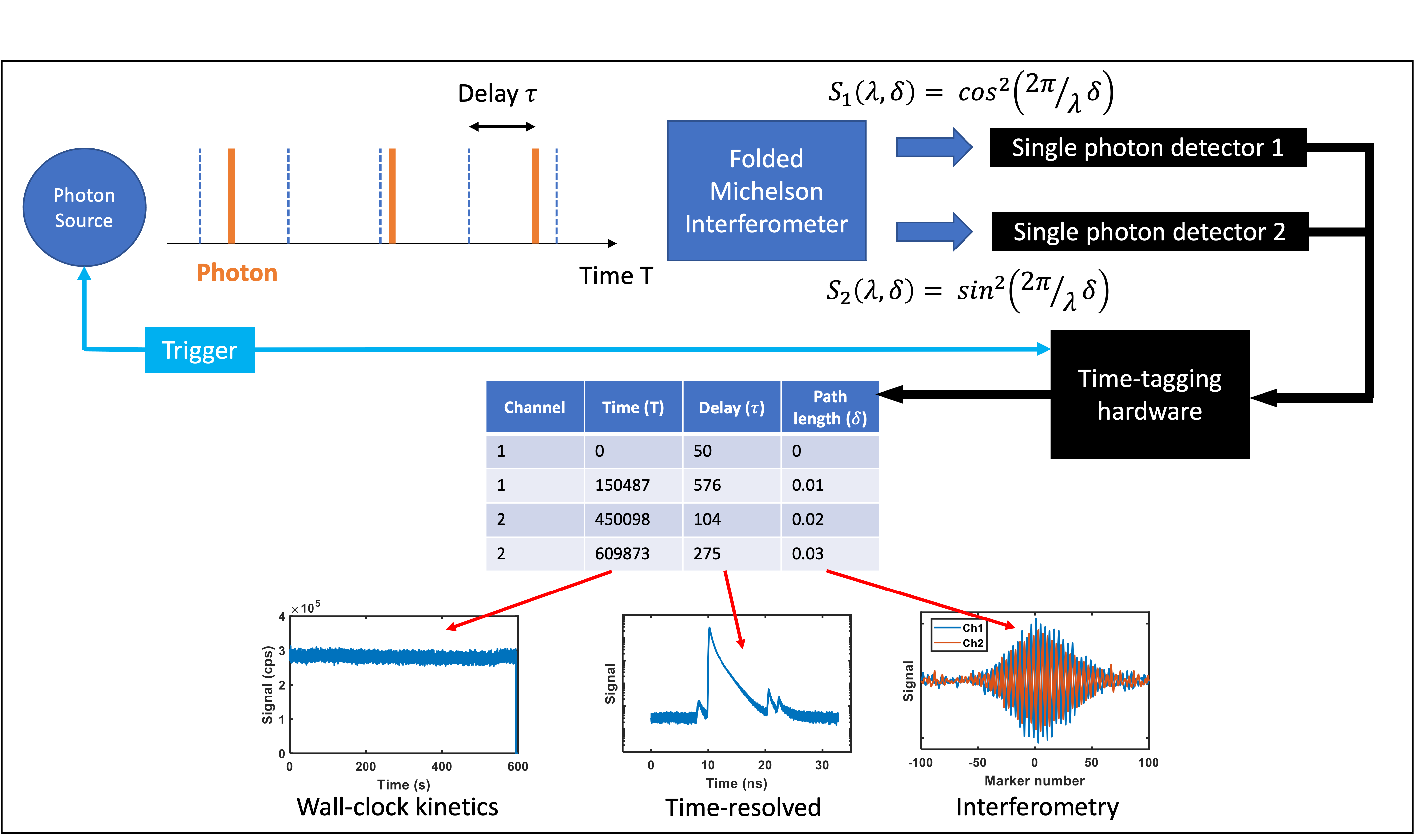 This combination means that unlike a typical spectrometry system, every photon can be measured, towards a 100% throughput. By outputting a stream of data as the photons arrive, we can measure the arrival rate (giving brightness, or changes with time), the arrival time (giving fast delay dynamics), the variation with interferometer position (giving photon energy) and the arrival channel. The latter measure can also be used to provide quantum measurements, such as bunching/antibunching from lasers and single photon sources.